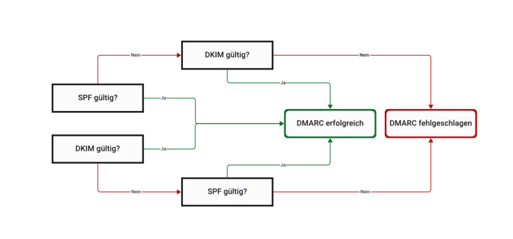 Zusätzlich fordert DMARC ein Alignment, bei dem die geprüfte Domain mit der im From-Header sichtbaren Absenderdomain übereinstimmen muss.
